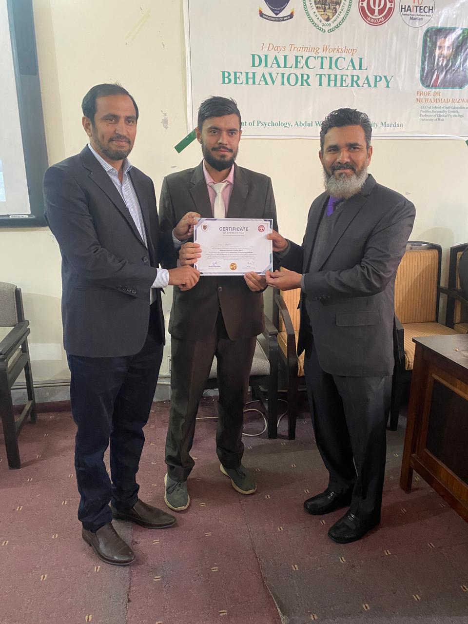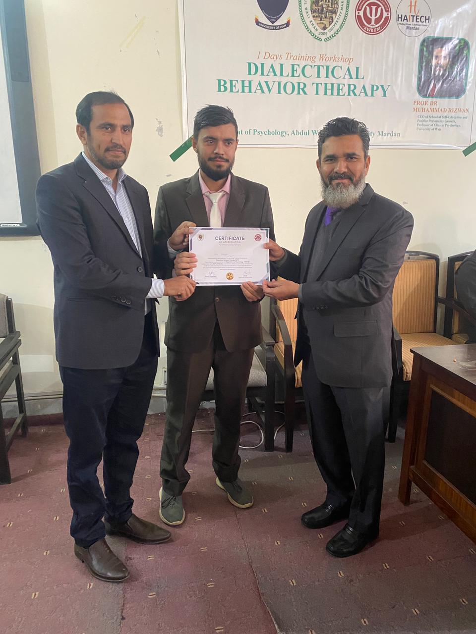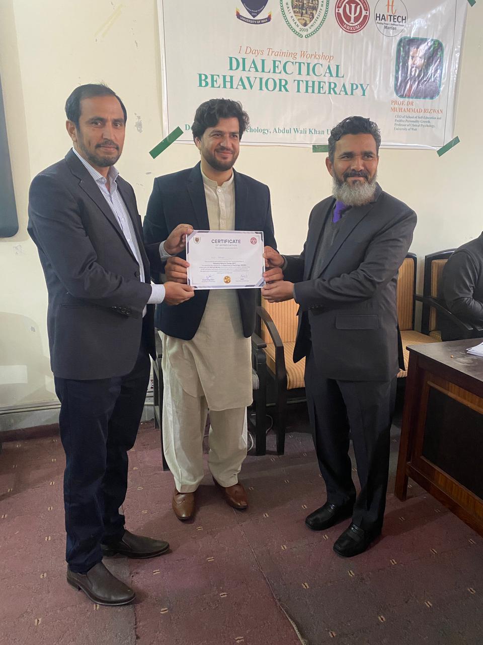 Dr. Muhammad Rizwan, CEO of the School of Self-Education and Positive Personality Growth, is pleased to share that a one-day Dialectical Behavior Therapy (DBT) workshop was successfully conducted at Abdul Wali Khan University, Mardan (AWKUM). The workshop focused on building a clear understanding of DBT and its practical use in mental health settings. Participants were introduced to core DBT concepts and key skill areas, with an emphasis on how DBT-informed approaches can support clients in managing intense emotions, improving coping strategies, and strengthening interpersonal functioning. The session also encouraged discussion and learning through interactive engagement, making the training both practical and relevant for students and professionals. The School extends its appreciation to Abdul Wali Khan University, Mardan, for facilitating the workshop and providing an enabling learning environment. Gratitude is also shared with all participants for their active involvement, interest, and commitment to improving mental health knowledge and practice. This one-day workshop reflects the School’s ongoing mission to promote evidence-based psychological education and strengthen professional capacity through meaningful training initiatives.
